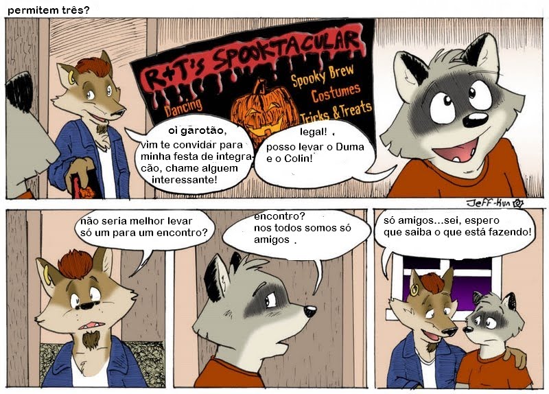 uma otima historia de um guaxinim que se apaixona pelo seu melhor amigo rapozo, mas tem medo de ¨¨sair do armario¨¨ e estragar a amizade e ao mesmo tempo comela a se relacionar com um guepardo que senta atras dele na aula de biologia,foi a primeira comic que traduzi e umas das primeiras comics que eu li,feita por um artista que admiro muito leaf, (http://www.furaffinity.net/user/leafdog)a comic está traduzida em varias linguas,mas a tradução para português parece ter sumido então leaf deixou eu postar aqui,não são todas as paginas,podem ver as paginas que ainda não foram traduzidas no site: http://raccoony.com